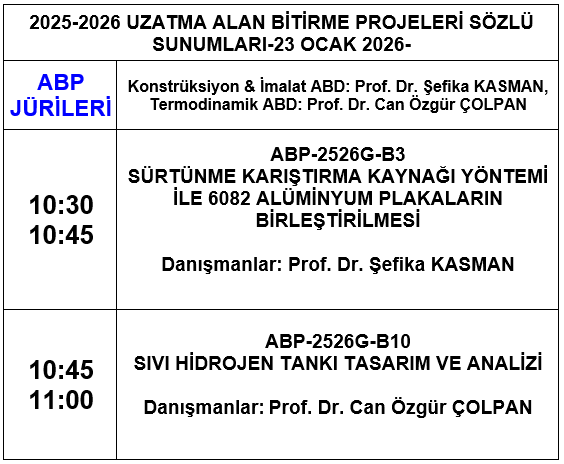 2025-2026 Güz Dönemi uzatma alan Bitirme Projeleri Sözlü Sunum Programını aşağıda bulabilirsiniz. En geç 10:15’te sunum yapacağınız sınav salonunda olmanız gerekmektedir.