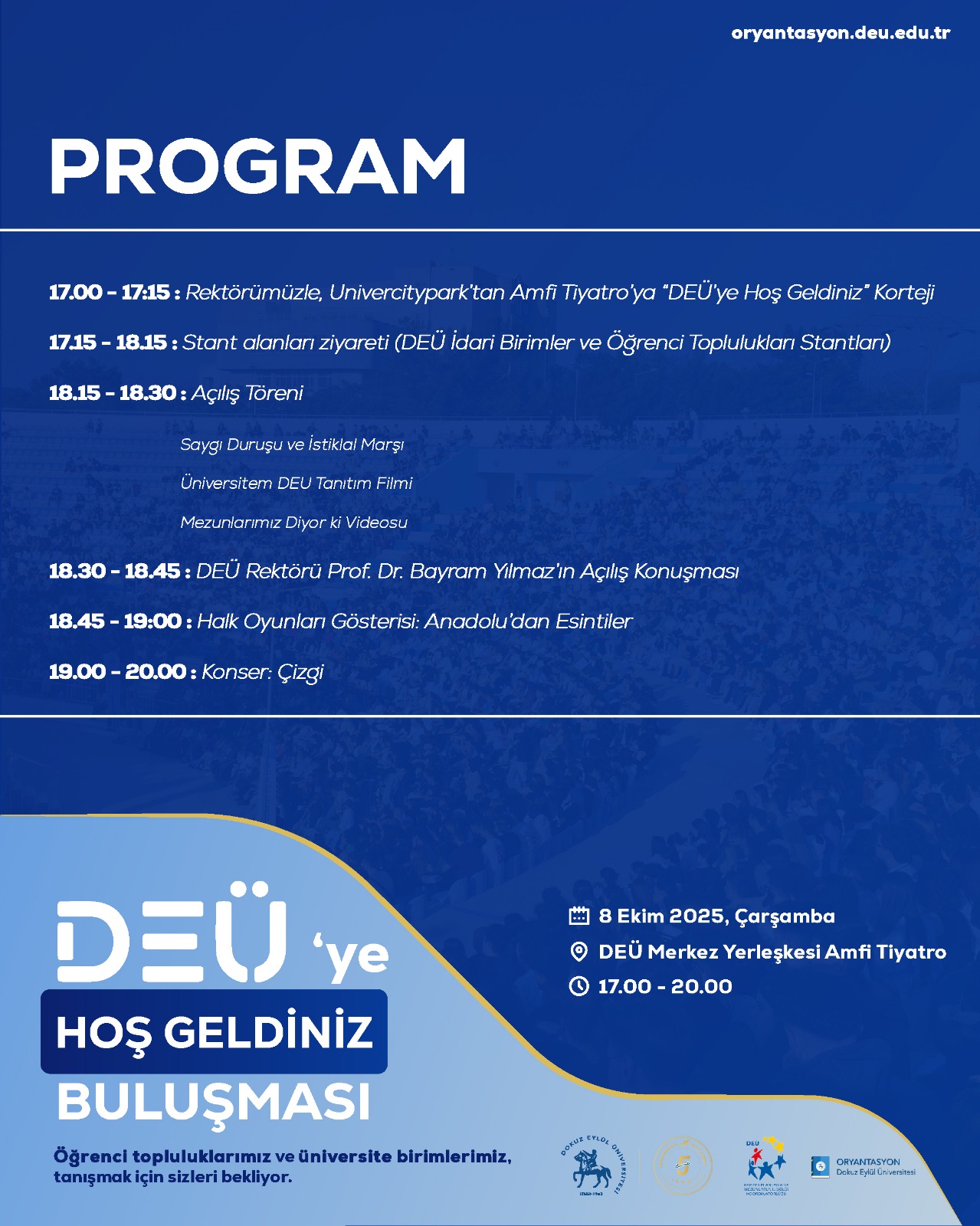Üniversitemiz 2025-2026 öğretim yılı fakülte/yüksekokul/meslek yüksekokullarının birinci sınıf öğrencilerine yönelik Kariyer Planlama ve Mezunlarla İlişkiler Koordinatörlüğü eşgüdümü ile birlikte yapılması planlanan “DEÜ’ye Hoş Geldiniz Buluşması” etkinliğinin 08 Ekim 2025 saat 17.00’de gerçekleştirilecektir. Etkinliğe ait afiş ve program aşağıda sunuşmuştur.
